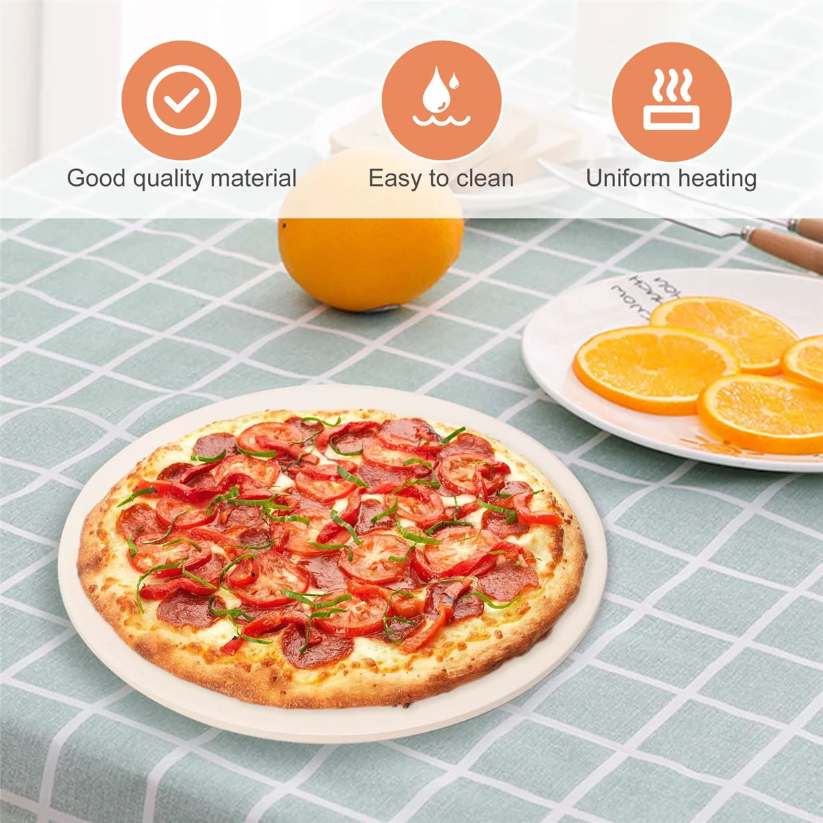 HIGH QUALITY - Our pizza stones are made of all-natural formulated cordierite, molding through 400 tons of pressure, heating over 2100 Fahrenheit for hours. Compare to Ceramic pizza stone, our pizza stone have a better thermal shock resistance which could reach to 1450 Fahrenheit( 787 Celsius). Just make delicious food with our pizza stone right now! DISTRIBUTES HEAT EVENLY - It is different with metal pans which often occurs sogginess, the professional grade porous material is highly absorbent to brick oven cooking which is much more efficient than metal and could draw out moisture from dough, make pizza or flatbread with crispy crusts. Throw your trouble metal pans away and choose our cordierite pizza stone! PERFECT SIZE - The pizza stone can be used to more than just pizza, the baking stone is also great for making cookies, loaves of bread, scones, cookies and more with family and friends. So it is not just a pizza stone, but a all-powerful baking assistant for your ! HOW TO CLEAN IT - Please do not wash it with dishwasher. Rinse to clean, and never use soap or detergent as it may be absorbed and affect the taste of foods. Never season pizza stone with oil or grease. Suggest to use tinfoil on the of the pizza stone when you make pizza. A WONDERFUL CHOICE - Imagine how your kids will react when you them the crispiest, most delicious pizza right out of your home oven - They will love it! It's also a good idea for gift, your friends will be happy with this pizza stone! Using Steps: Please preheat the stone before placing food on it. 1. Place the pizza stone itself in middle of oven or grill and pre-heat it at 500 Fahrenheit (260 Celsius) for about 30 minutes. 2. Sprinkle flour or cornmeal on top of the stone to create a non-stick . 3. Return both stone and pizza to the grill or oven, close the grill lid and the pizza for 10 to 12 minutes. 4. Check in halfway to the pizza is not overheated. 5. Once the is brown, remove the pizza from stone. Enjoy at once. The way of Cleaning a Pizza Stone 1. Let the stone completely cool off before washing. 2. Never use soap or detergent on a stone because the porous of the stone will absorb cleaning liquids and leave a soapy aftertaste. 3. Hand wash with warm water. Not dishwasher safe. 4.Use the , brush or nylon pad to remove excess food. 5. Air dry or dry the stone in an oven completely after cleaning. colour: beige Material: Cordierite size: 30.5x30.5x0.8cm Package Contents: 1*Pizza Board Only the above package content, other products are not included. Note: Light and different displays may cause the color of the item in the picture a little different from the real thing. The measurement allowed error is +/- 1-3cm.