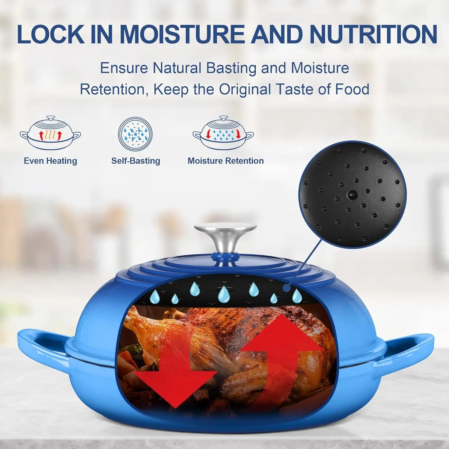 - Self-Basting Lid: Dome lid with self-basting bumps traps steam for a crisp crust and exceptional flavor.