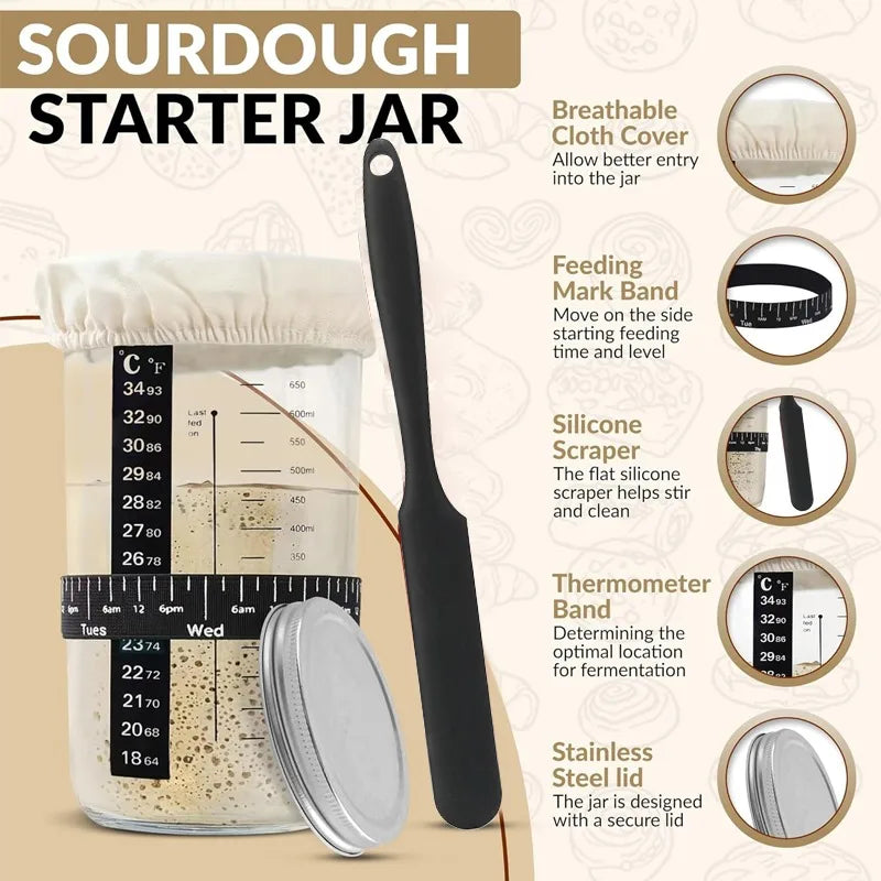 - Sourdough Starter Tool Kit ($25.97): Includes a 650ML jar, linen liner, silicone spatula, feeding date elastic band, thermometer sticker, and “L” type brush. Perfect for maintaining your starter.